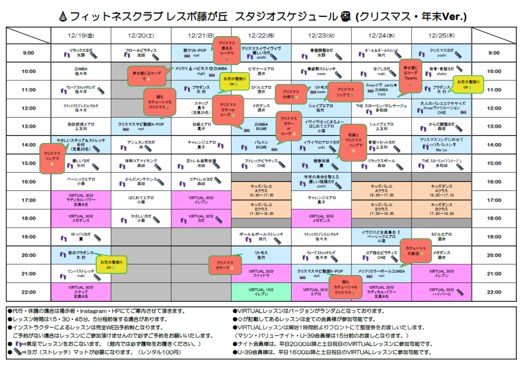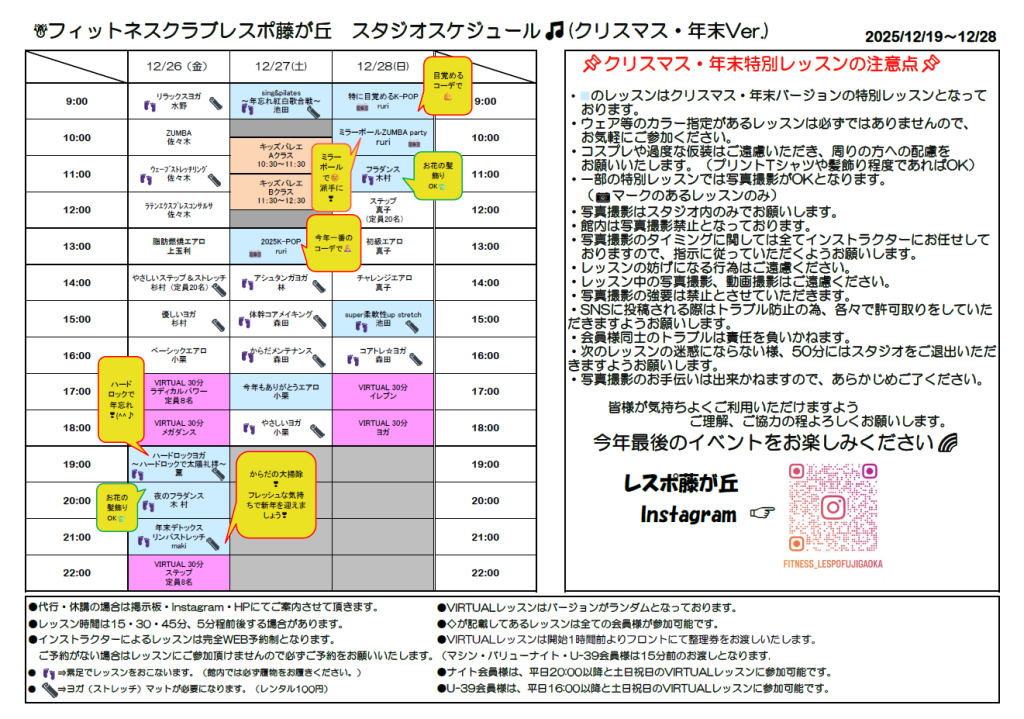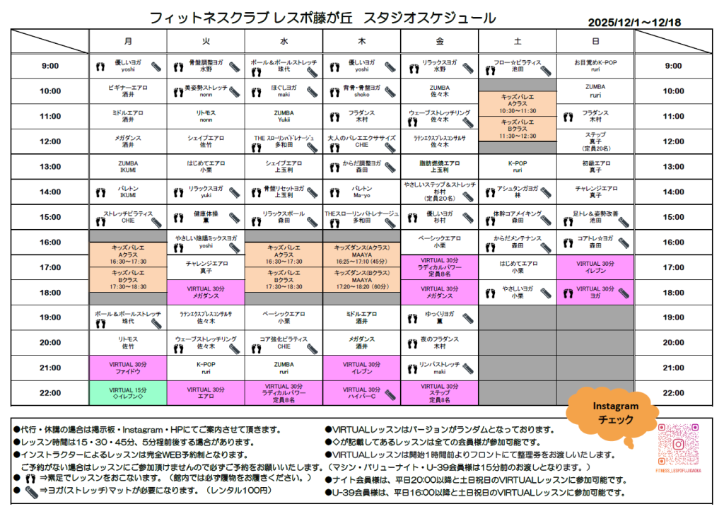 12月中のyoshiインストラクターのレッスンは手首骨折のためすべてVIRTUAL ヨガ(30分)に変更させていただきます。 2026年1月より復帰予定となります。