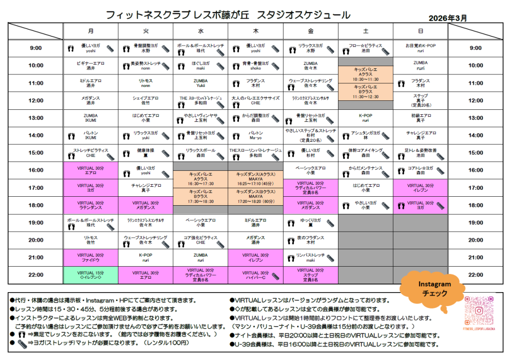 3/16(月)9:00~ 優しいヨガ(yoshi)→VIRTUALヨガ(30分)