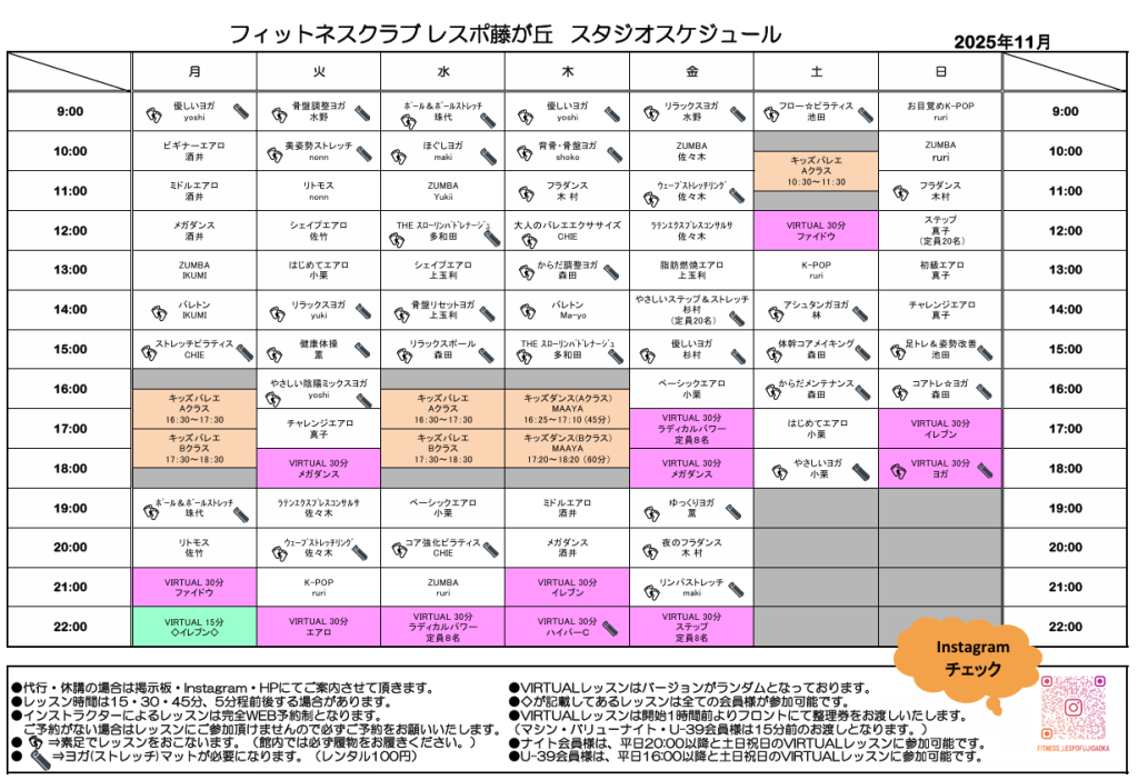 11/10(月)15:00~ ストレッチピラティス(CHIE)→VIRTUAL ヨガ(30分)