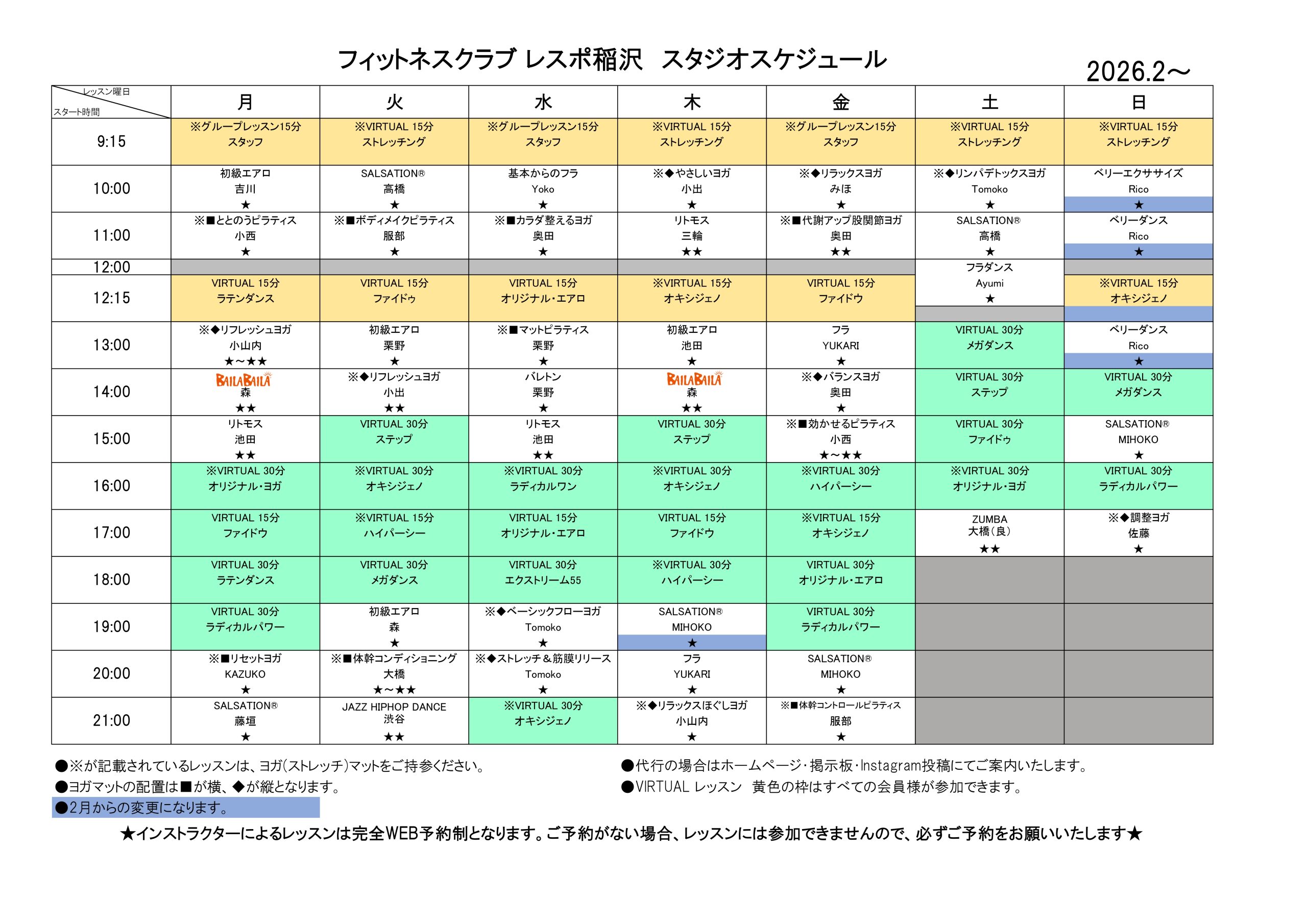 今月のスタジオスケジュール