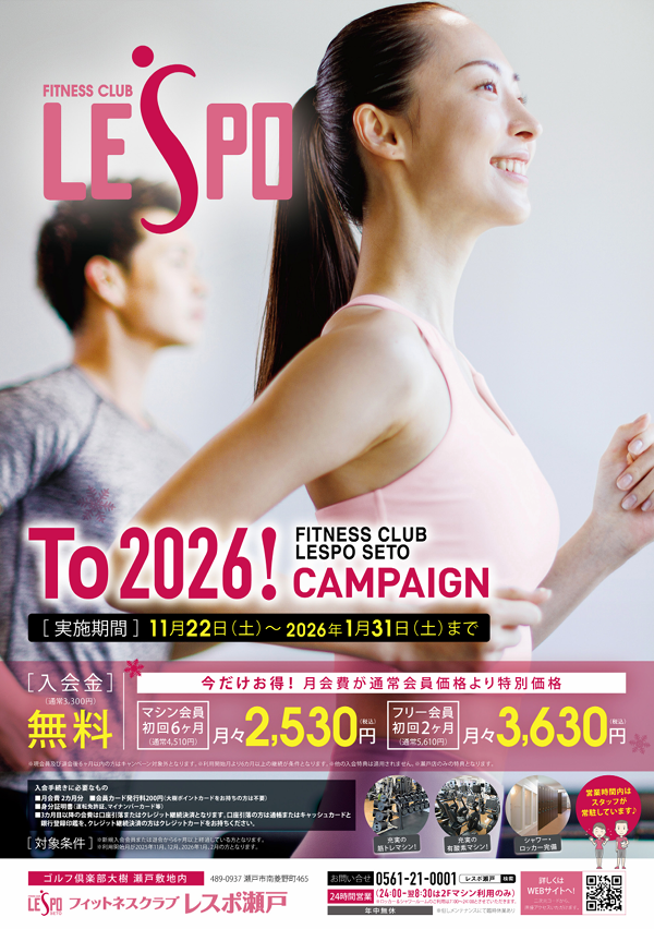 フィットネスクラブ レスポ瀬戸は年中無休で24時間営業しておりますので、朝活や仕事帰りにもお気軽にご利用いただけるフィットネスクラブです。