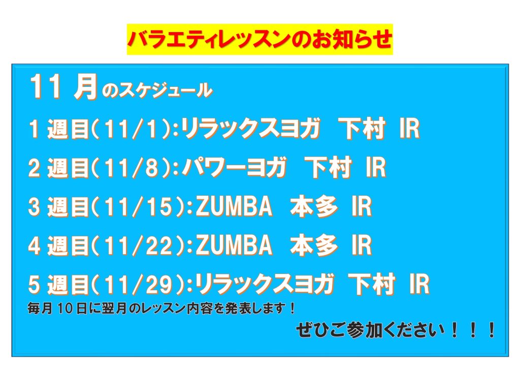 11/1(土) | 14:00~ | ベーシックピラティス(★~★★) 角谷 | ⇒ | ZUMBA(★~★★★) 鵜殿 |