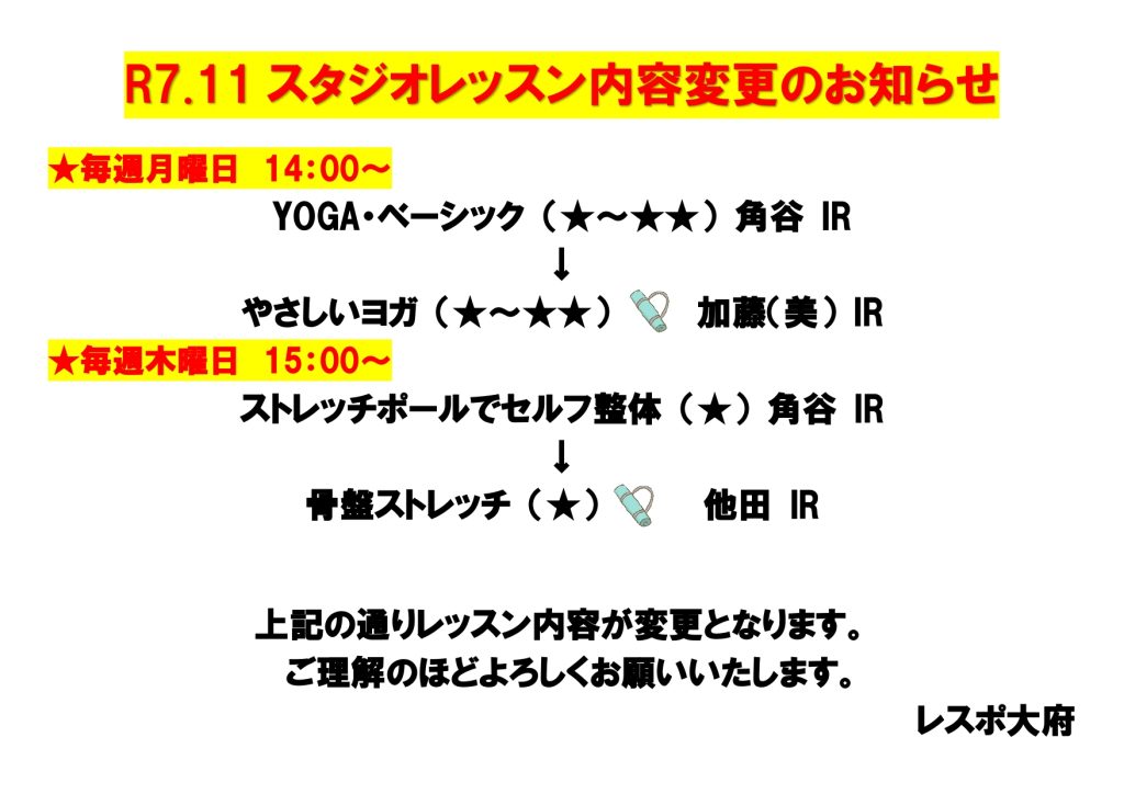 11/15(土) | 14:00~ | ベーシックピラティス(★~★★) 角谷 | ⇒ | ※からだ調整(★) 本多 |