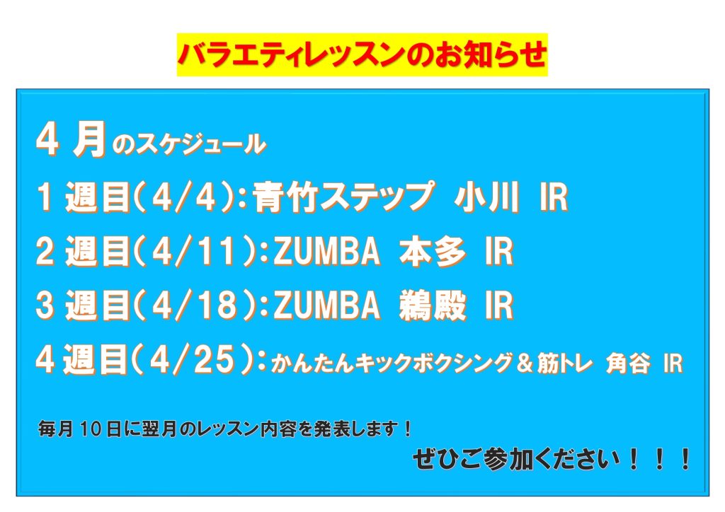 | 3/21(土) | 12:00~ | しっかりステップ(★~★★) 伊藤 | ⇒ | ZUMBA(★~★★★) 鵜殿 |