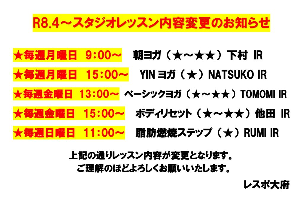 | 日付 | 時間 | 変更前レッスン | 変更後レッスン | |