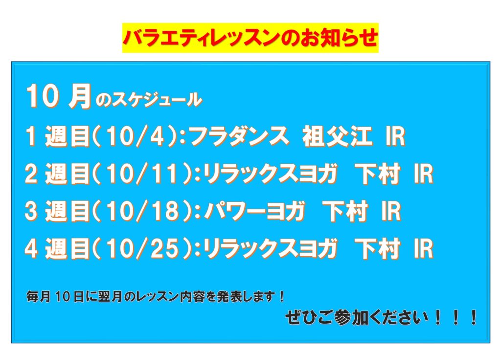 10/6(月) | 14:00~ | YOGA・ベーシック(★) 角谷 | ⇒ | スマイルエアロ(★~★★) 鵜殿 |
