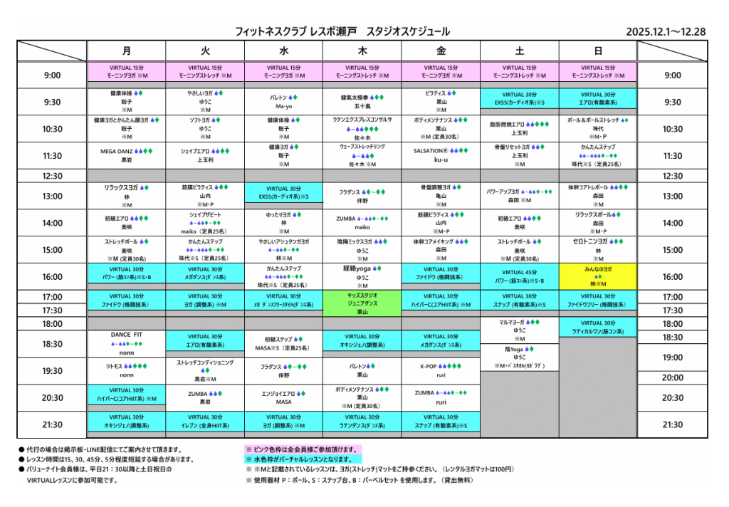 | 12月5日(金) | 13:00~ | 骨盤調整ヨガ 亀山 | ⇒ | VIRTUAL オキシジェノ 30分 |