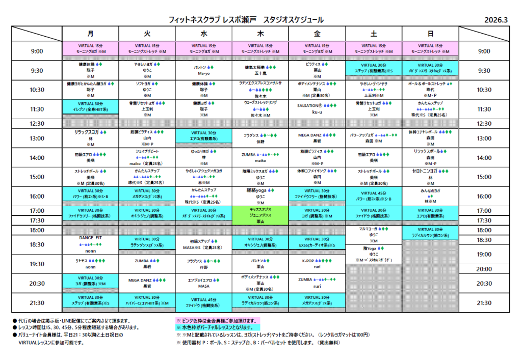 今月のスタジオスケジュールとスタジオ変更のお知らせ